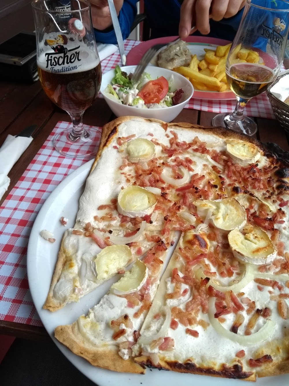 Danach ging es kreuz und quer durch den Schwarzwald Richtung Frankreich. In Rixheim haben wir unser Quartier bezogen. Direkt unterhalb der Vogesen. Morgen geht es dann direkt in die Vogesen. Im Hotel haben wir gegessen. War ganz lecker. Ich hatte Flammkuchen mit Ziegenkäse und Honig.