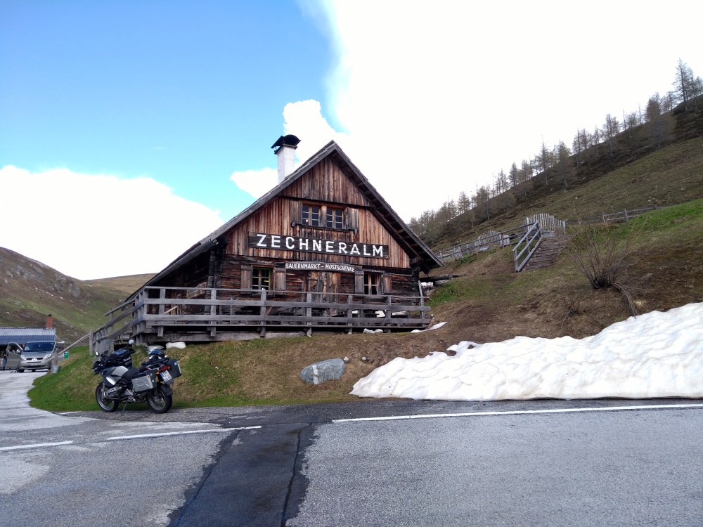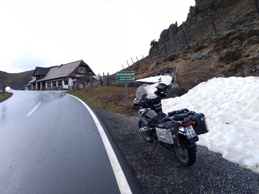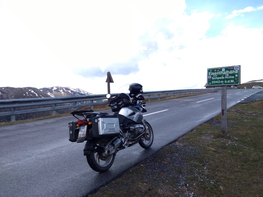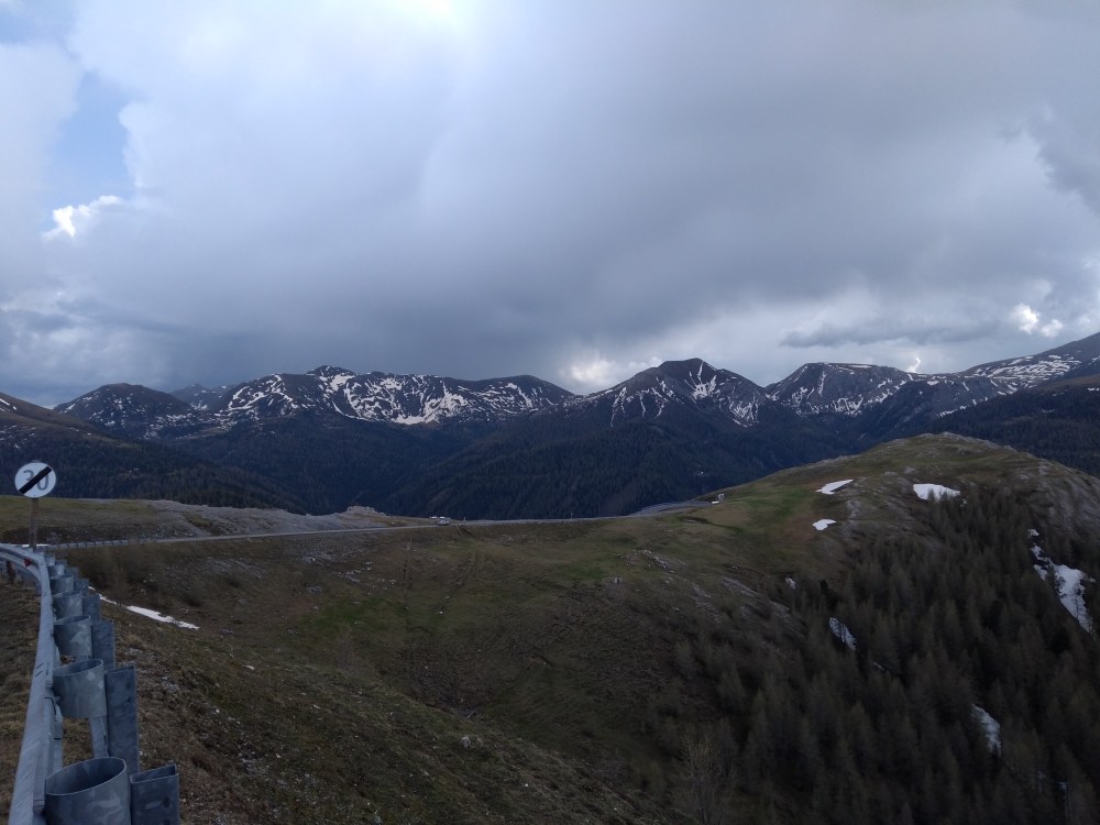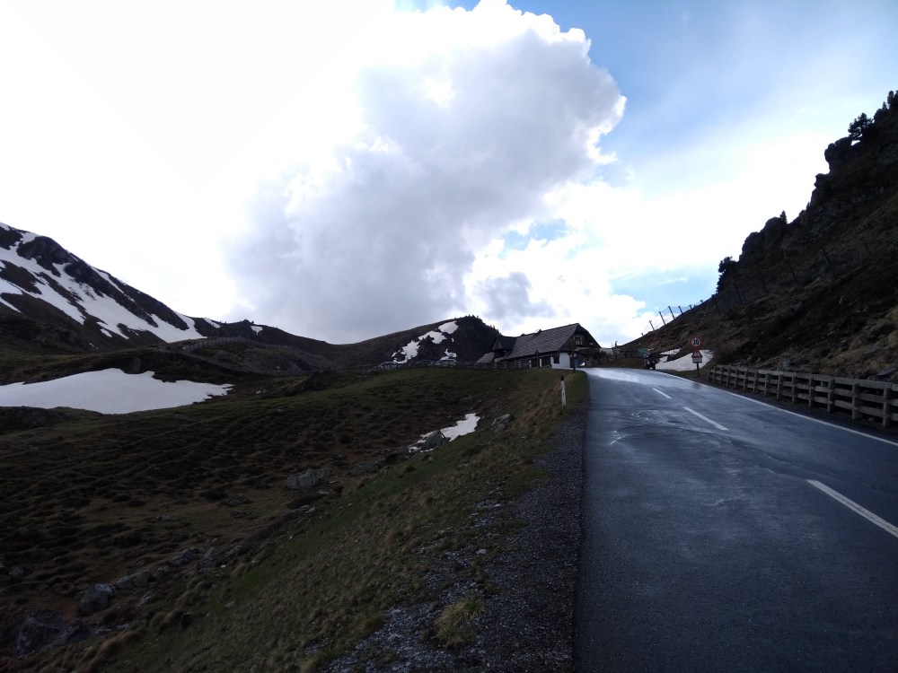 In Österreich habe ich mich auf den Weg zur Nockalm Hochstraße gemacht. Kaum war ich auf Österreicher Seite hat es zu tröpfeln angefangen. Ich hatte aber mehr oder weniger Glück. Ich blieb zwar trocken, aber die Straße war nass. Schade nur halber Spaß. Aber die Nockalm Hochstraße mit Ihren zwei Pässen mit je über 2000m sind ein Traum. Und ich war total alleine Unterwegs. Der Spaß kostet zwar 12 Euro, ist es aber bei trockener Straße auf jedefall Wert.