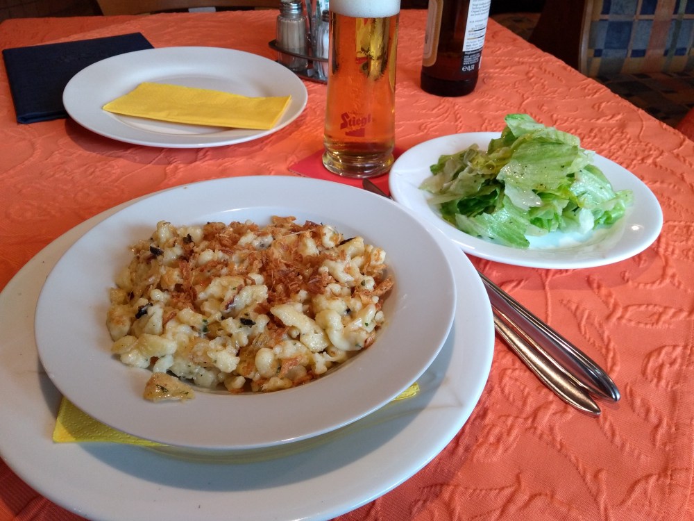 Kaspressknödelsuppe und danach Kärntner Käsespätzle. War sehr lecker.