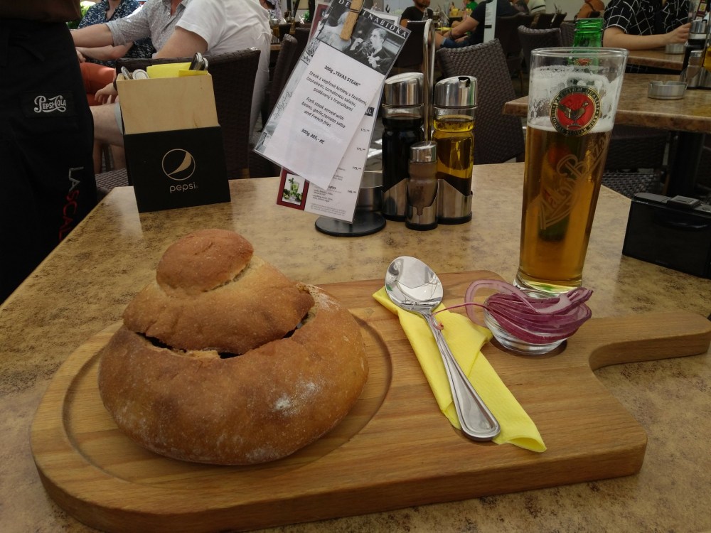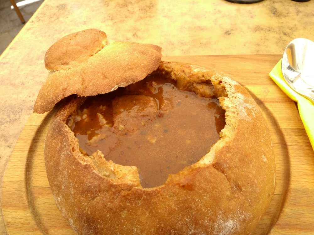 Direkt an der Mauer der Teynkirche habe ich leckeres Gulasch aus dem Brot gegessen.
