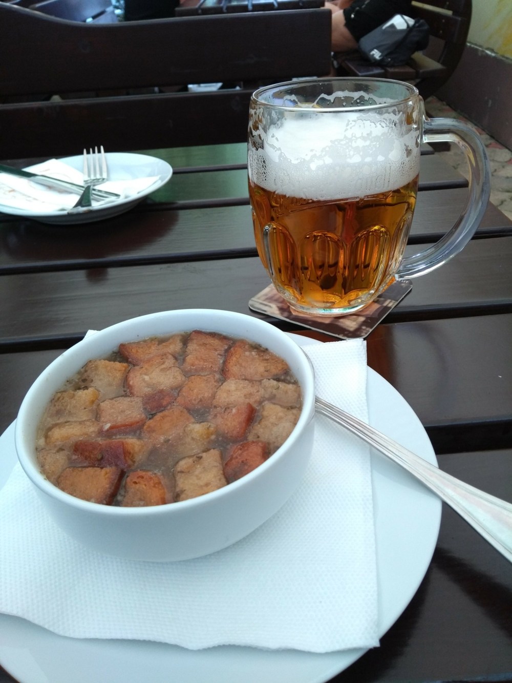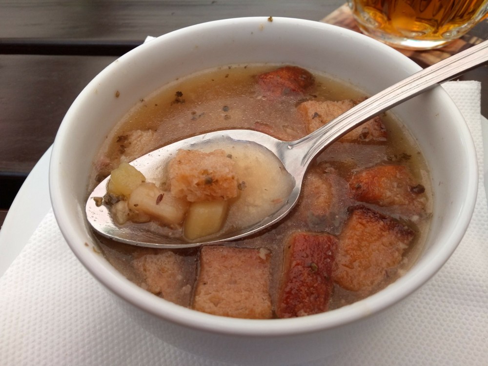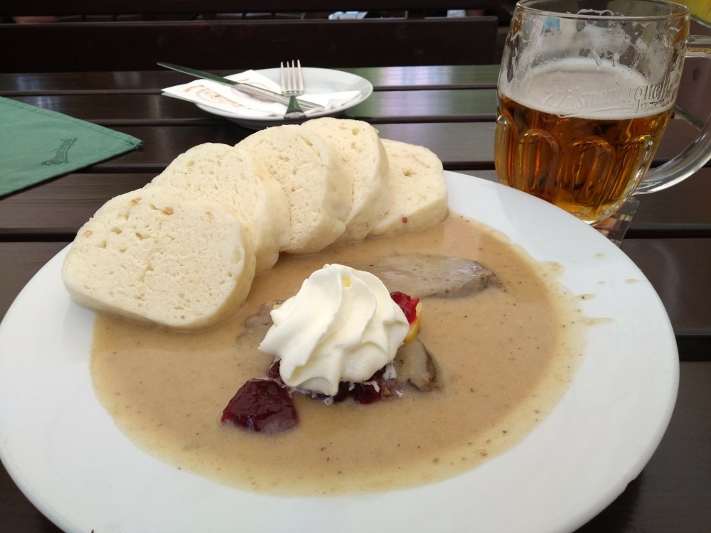 Erst mal eine Grundlage gelegt mit Bier, Knoblauchsuppe und Rinderfilet mit Serviettenknödel.