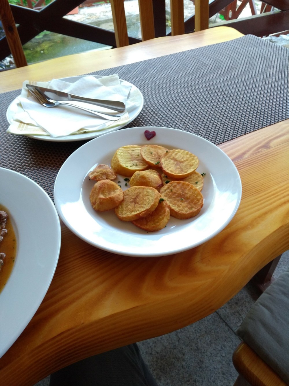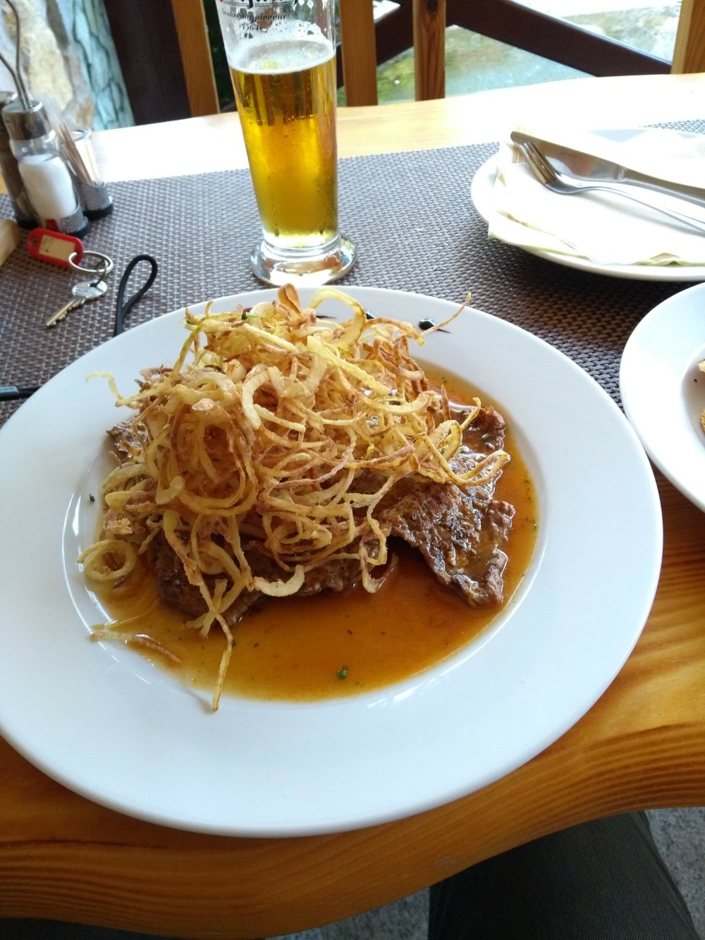 Das Wiener Rindersteak war auf 1 cm zusammengeklopft mit Päckchensoße und fritierten Zwiebeln und Kartoffeln. Das Herz am Tellerrand konnte das auch nicht mehr retten. Man kann nicht immer gewinnen…