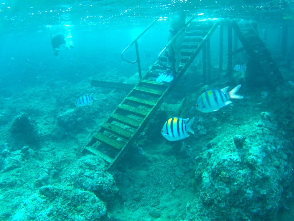 Das Schnorcheln war richtig Klasse. Am Steg gib es eine Leiter und es ist gleich richtig tief. So tritt auch keiner auf die Korallen.