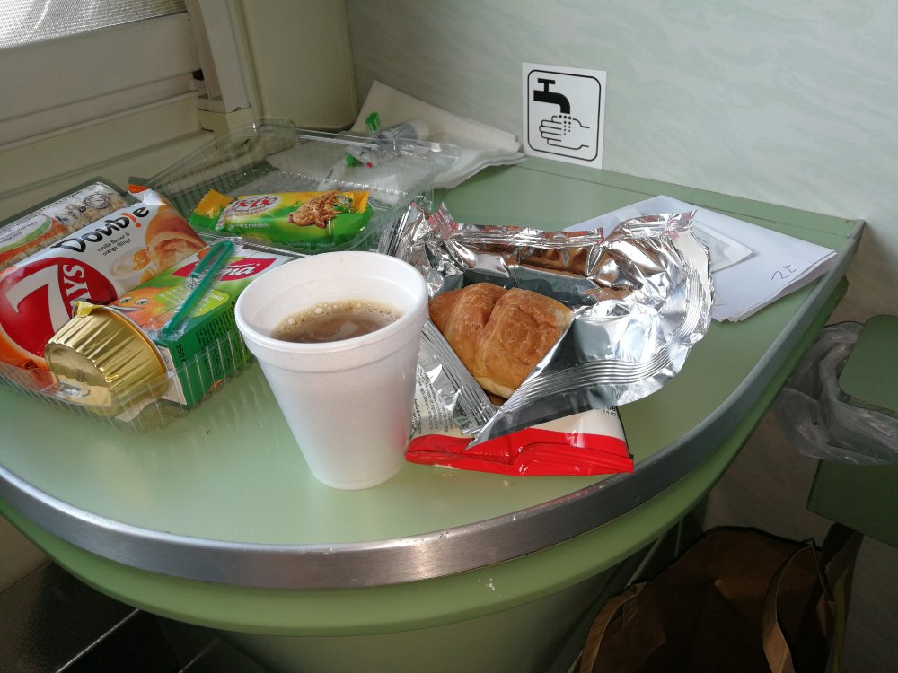 Der Zugbegleiter hat mir einen Kaffee vorbeigebracht und ich habe das Essenspaket geplündert.