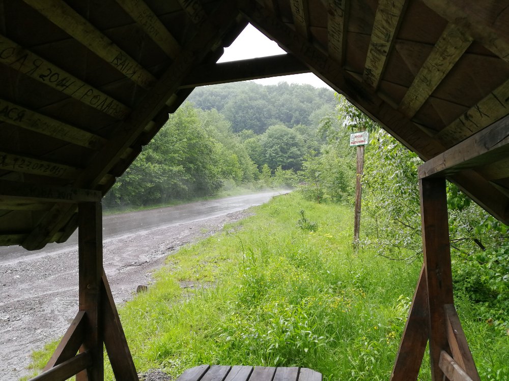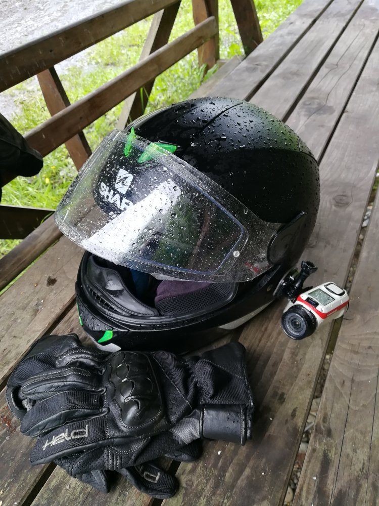 Gehen Nachmittag hat mich ein Gewitter erwischt. Ich habe mich dann etwas untergestellt. Die Schlaglöcher waren schlecht auszumachen, bei Regen auf dem Helm.