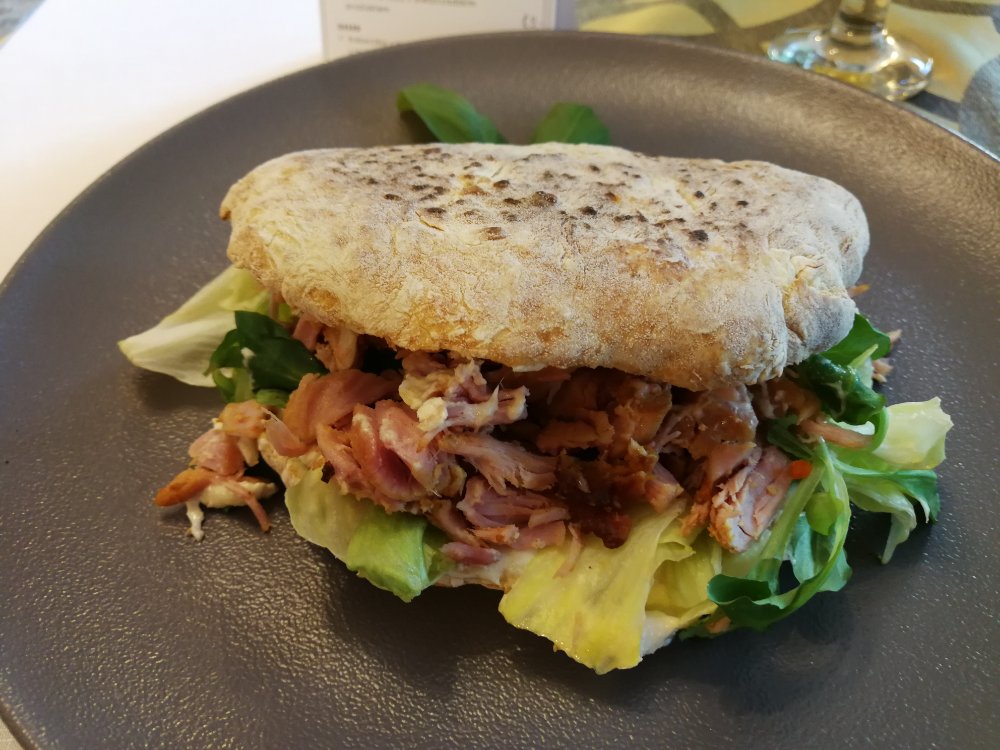 Das Hauptgericht ließ sich nicht komplett übersetzen. Es war leckeres Kasslerfleich in einem Fladen Brot mit Salat und leckerer Soße. Dazu Pommes.