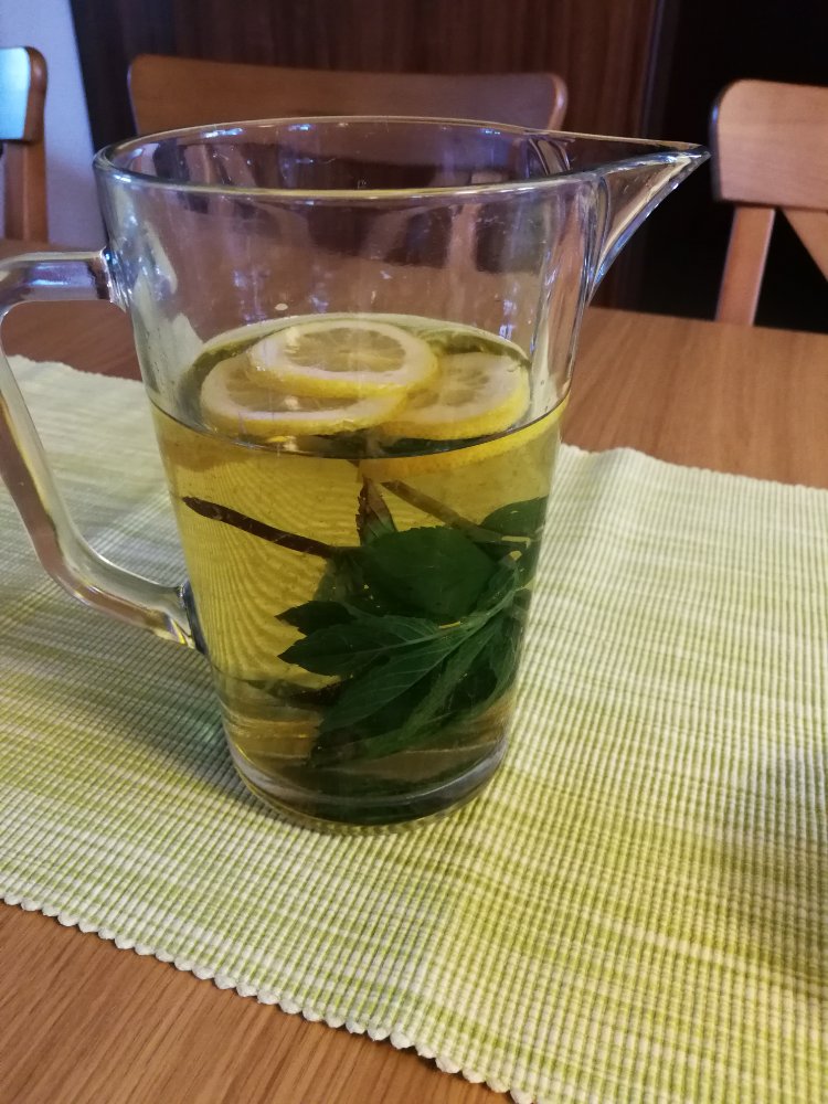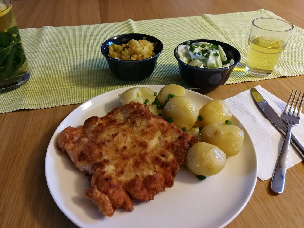 Zum Essen gibts ein Hünchenschnitzel mit Kartoffeln, einem Kohlgemüse und Gukensalat. Bin super happy damit. Und zum trinken gibt Pfefferminze Zitronen Tee.