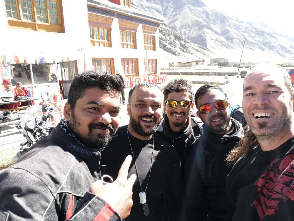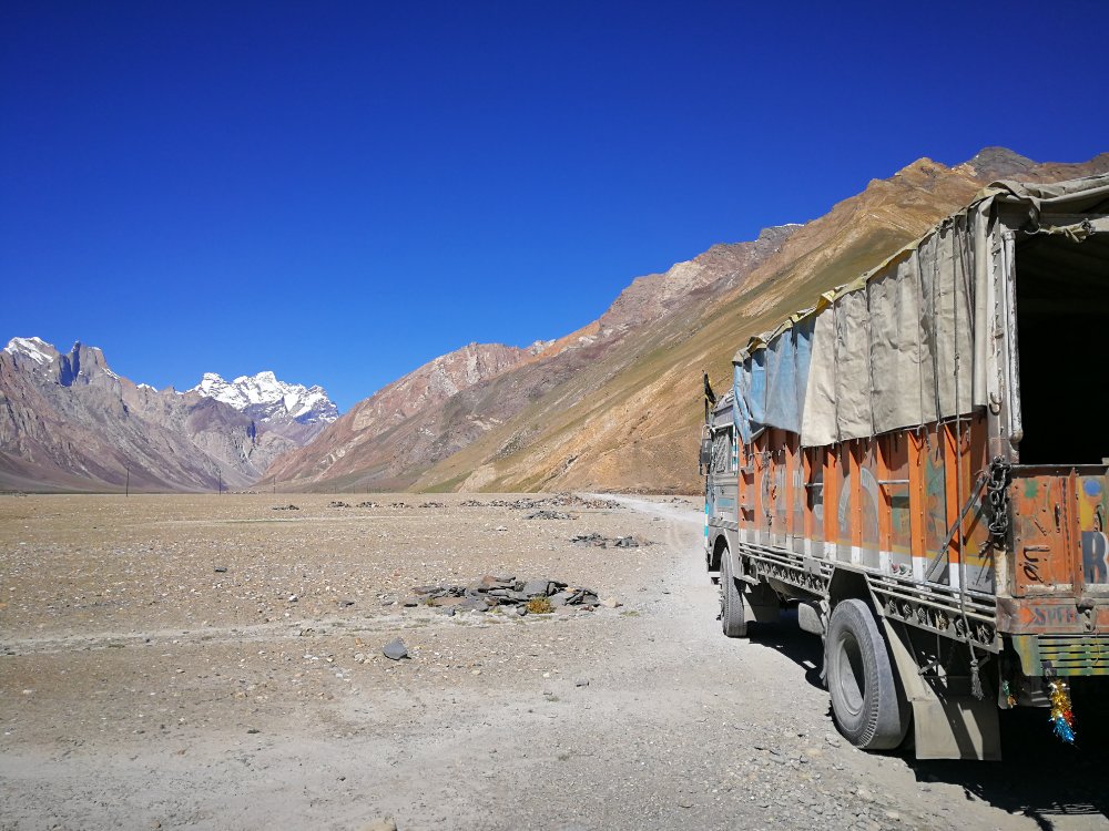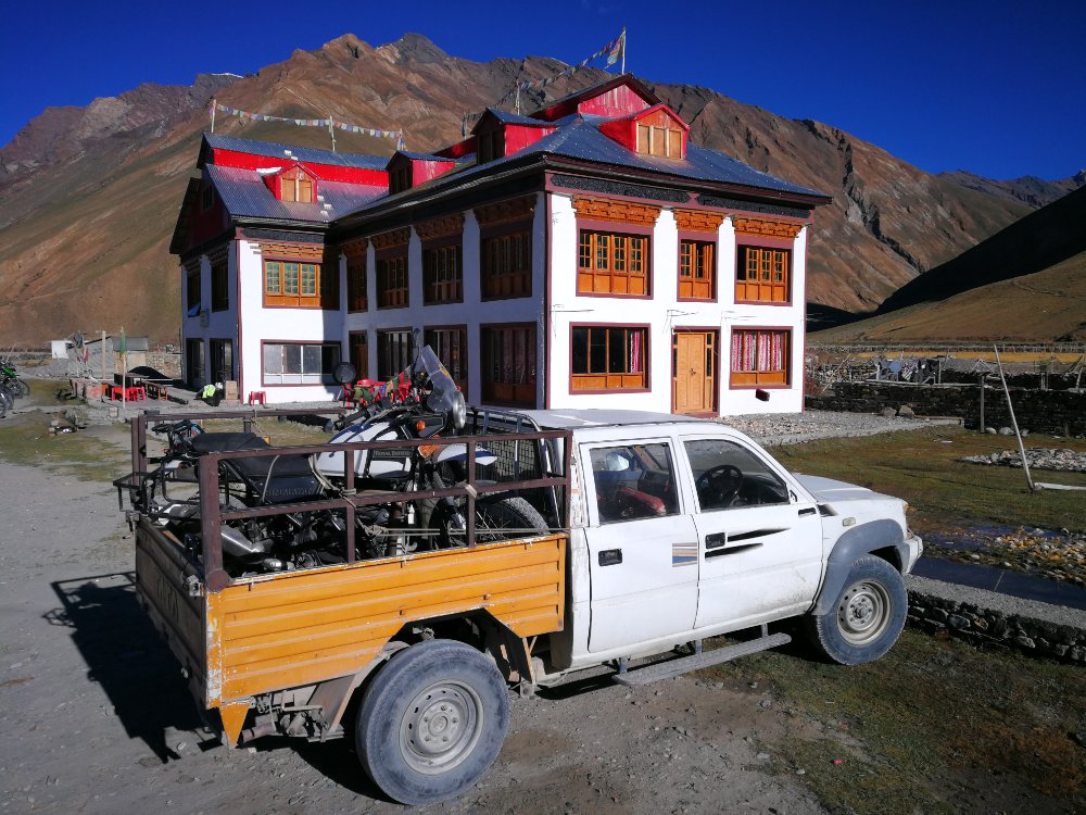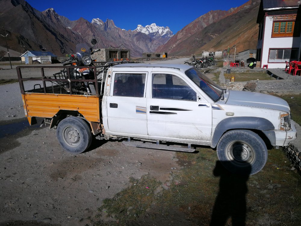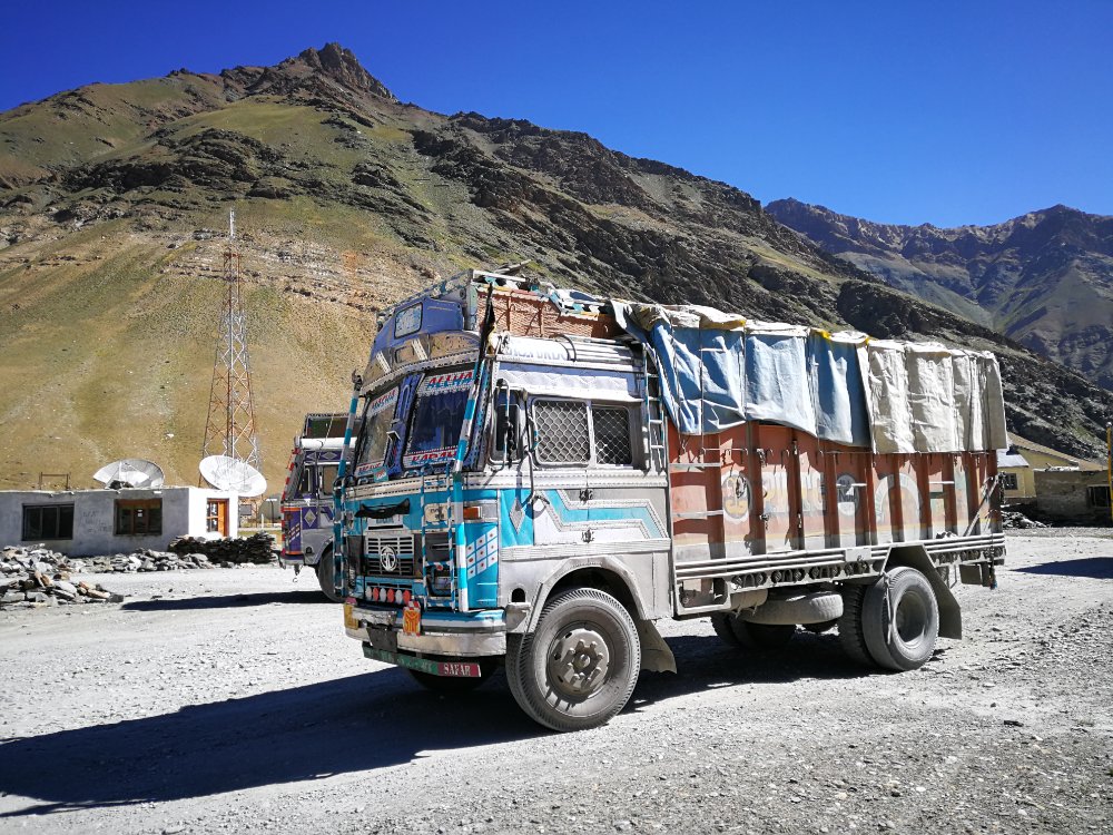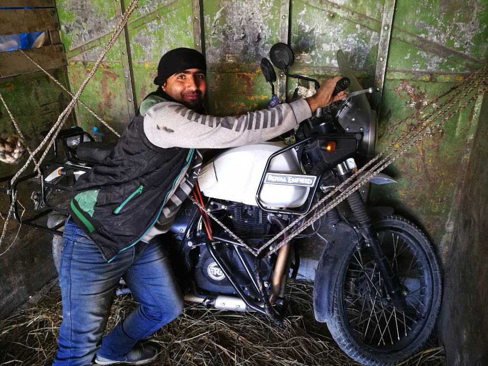 Danach haben wir das Bike abgeladen. Da die Trucks aus dem Zanskar Tal meist leer zurück fahren, ist die Idee nun diese zu fragen, ob sie das Bike und mich mit zurück nach Kargil nehmen. Ein Truck war schnell gefunden und das aufladen hat super funktioniert. Eine Planke und dann das Bike auf den hohen Truck gefahren und geschoben. Ordentlich festgezurrt. Schnell noch ein Abschiedsfoto von der Motorradgruppe …
