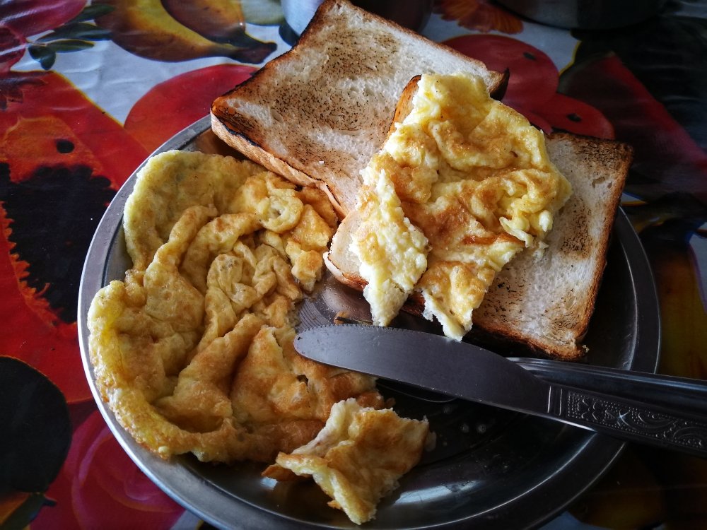 Geschlafen habe ich den Umständen entsprechend ganz gut. Bei Licht habe ich erst mal das Bike begutachtet. Trotz des geschaukel ist alles i.O., bis auf dem Platten hinten.