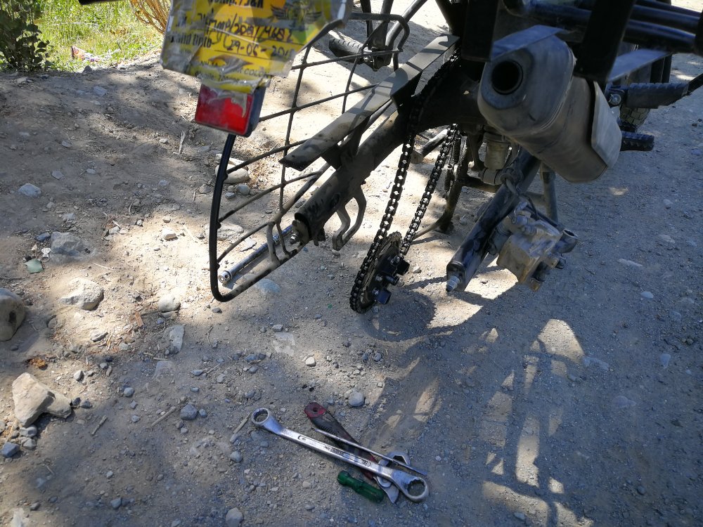 Aber hilft ja alles nichts. Also wieder das Gepäck mit den Wertsachen geschultert und losgelaufen. Nach ca. 1km waren ein paar Jungs um ein Kaffee/Shop gestanden. Ich habe Sie um Hilfe gebeten. Einer hat sich bereit erklärt mir zu helfen. Mit seinem Auto sind wir zu einem Reifentypen ganz in der Nähe gefahren. Er hat uns Werkzeug gegeben und ich habe das Rad ausgebaut. Das hat er dann zum Reifentypen gefahren. Ich habe am Motorrad gewartet.