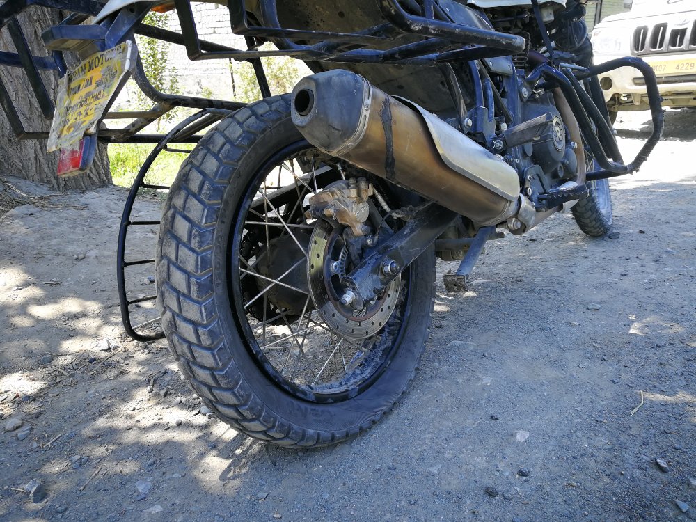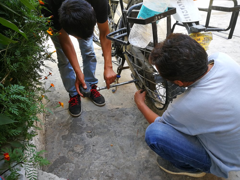 Heute Morgen bin ich ganz entspannt gegen 8 Uhr aufgestanden. Nach dem obligatorischen Omlett mit Butter Toast habe ich den Hotelmanager aufgesucht. Er hat ein jungen Kerl mit Auto besorgt und Ihn instruiert. Dann ging es zum besten Enfield Mechaniker in der Stadt. The Royal Enfield Engine Mystery. Er hat sein Werkzeug eingepackt und dann sind wir zurück ins Hotel gefahren. Dort hat er kurz das Rad ausgebaut und damit sind wir zu einem Reifenfritzen gefahren. Der hat den Schlauch ausgebaut und einen Riss am Ventil festgestellt. Also einen neuen Schlauch besorgen. Der Shop war gleich neben an. Es ist echt witzig, jeder hat seinen Job und keiner übernimmt Aufgaben von dem anderen. Aber als Kunde hast du die Rennerrei. Also mit dem Schlauch zurück zum Reifenfritzen. Der hat den Schlauch eingebaut und dann mit dem Rad zurück ins Hotel. Der Engine Gott hat das Rad wieder eingebaut und wir sind zuzweit auf der Himalayan zurück zu seinem Shop gefahren.