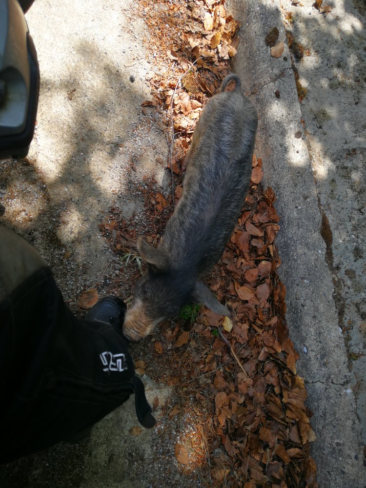 Auf der anderen Seite sind uns endlich die ersten Schweine begegnet. Die Frischlinge waren echt neugierig. Mein Schuh wurde beschuppert und ein schwarzes Schwein hat sich an meinem Vorderrad geschuckert. War richtig schön.