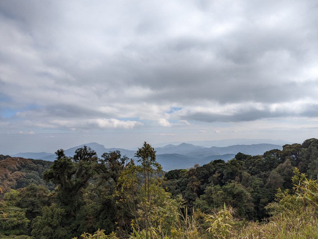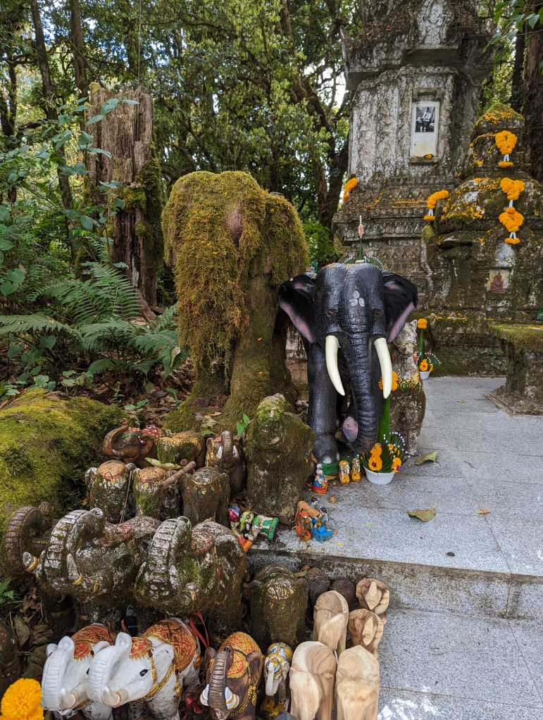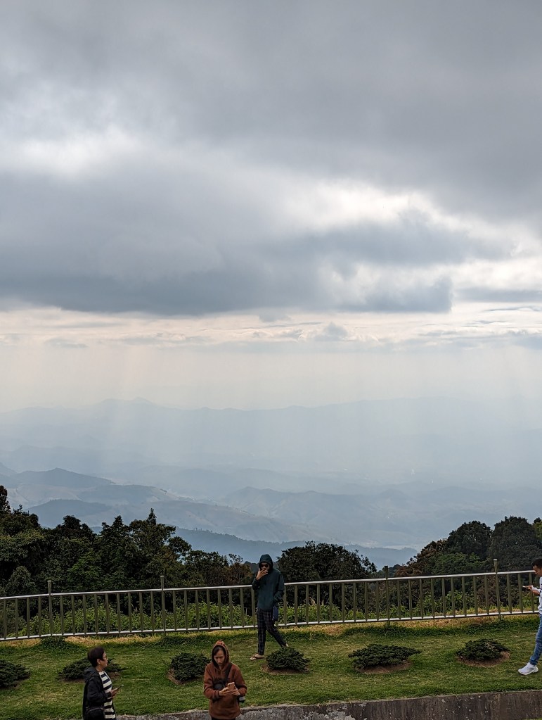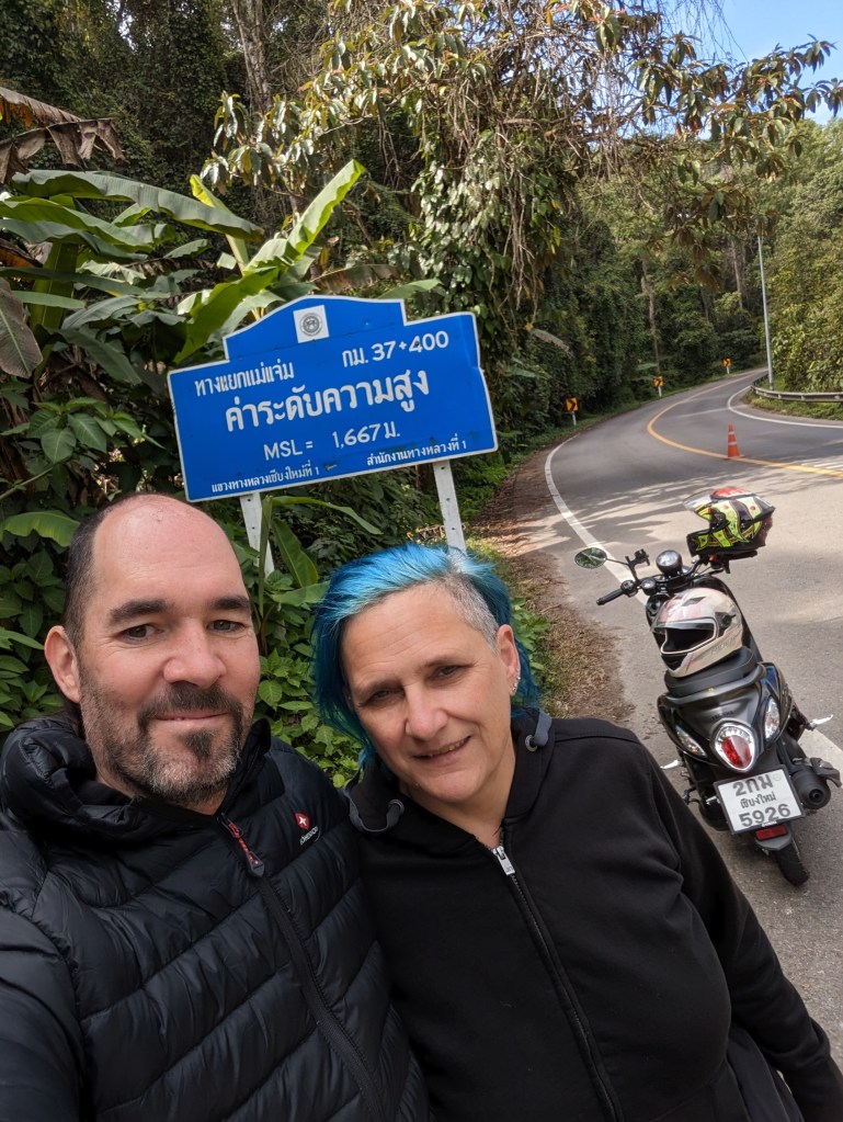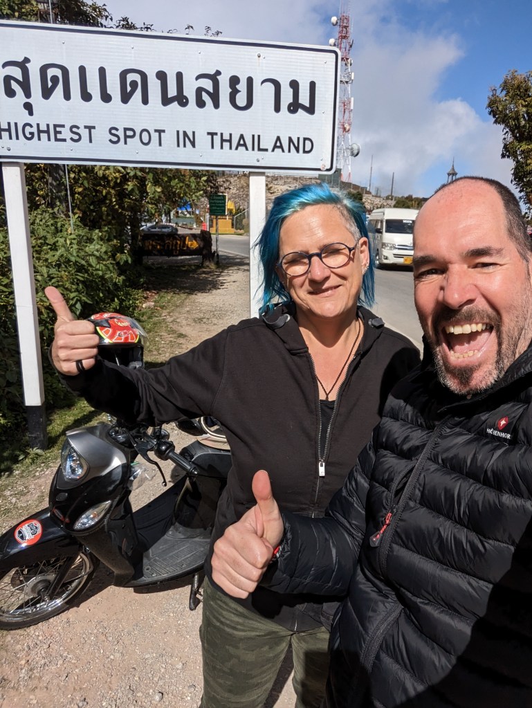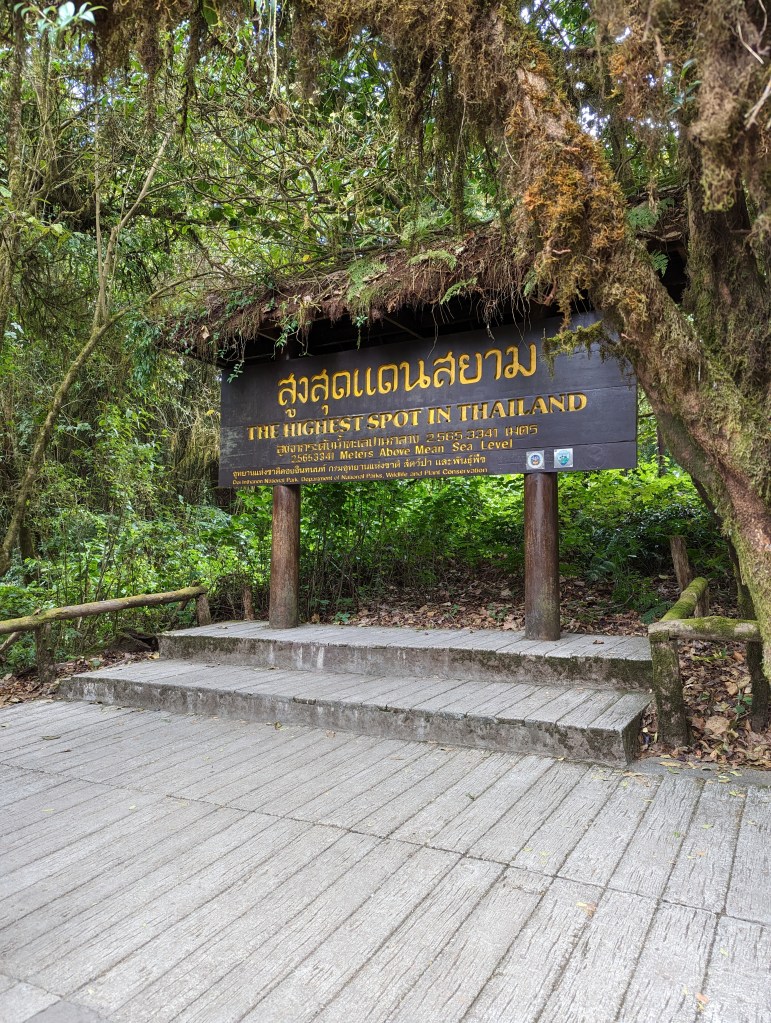 Oben ist ein kleiner Park angelegt. Die Vegetation ist in der Höhe total anders. Überall Moos an den Bäumen. Und die Thais nehmen es ganz genau. Der Berg hat am höchsten Punkt 2565,3341 Meter Above Mean Sea Level, wie die Tafel anzeigt.