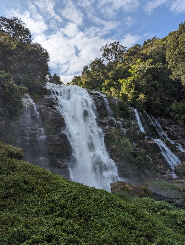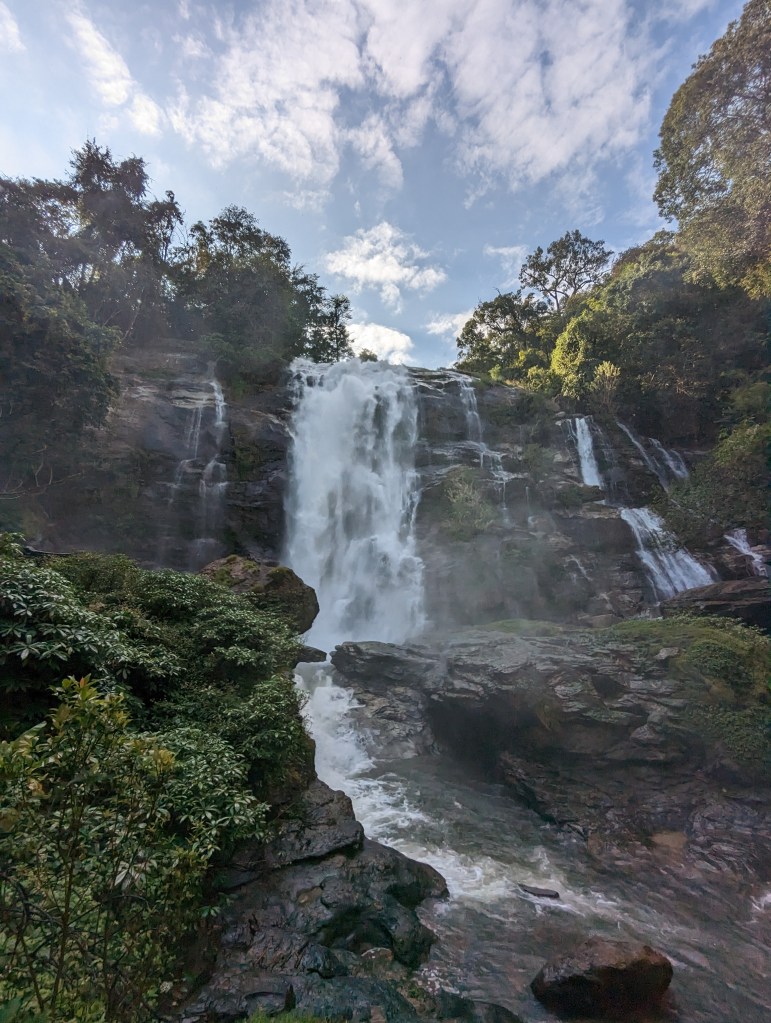 Auf dem Rückweg haben wir noch ein einem tollen Wasserfall halt gemacht. Dem Wachirathan. Durch die Fallhöhe und dem Wind wurden wir mit einem feinen Sprühnebel bedeckt. Vormittags wenn die Sonne von vorne kommt entstehen dadurch schöne Regenbogen.