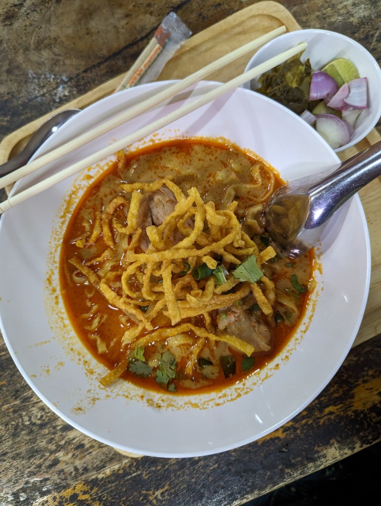 Alles hat prima geklappt. In Chiang Mai haben wir dann richtig Hunger bekommen. So das wir erst leckere gebratenen Nudeln gegessen haben und dann zum Abschluss die leckere Khao Soi Curry Nudelsuppe. Das ist unser letzter Abend in Chiang Mai und es geht Morgen wieder Richtung Süden.