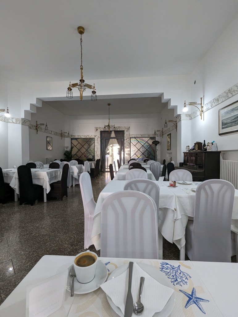Guten Morgen aus Fontachello. Wir haben heute so lala geschlafen. Eine nervige Stechmücke hat immer wieder um unsere Ohren gesummt. Irgend wann in der Nacht hat dann der Nachbar sich lautstark übergeben. Kann passieren. Das Frühstück war wie gehabt in Ordnung. Auch heute gab es Kaffee Nachschub. Der Raum ist irgendwie unpassend. Eher ein Festsaal, aber es gibt schlimmeres.