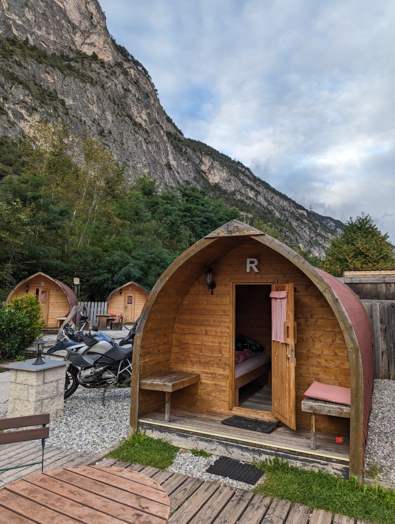 Danach ging es den Rest des Ötztales runter. Direkt am Inn ist unsere Unterkunft. Wir nächtigen heute in einem Fass. Mit Parkplatz direkt davor für die Mopeds.
