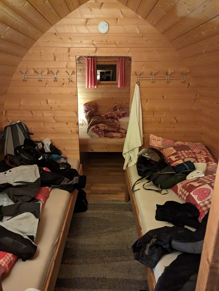 Darin sind 4 Betten. Die Dusche und Klo ist direkt dahinter. Mal schauen wie kalt es heute Nacht wird. Wir haben jedenfalls dicke Decken.