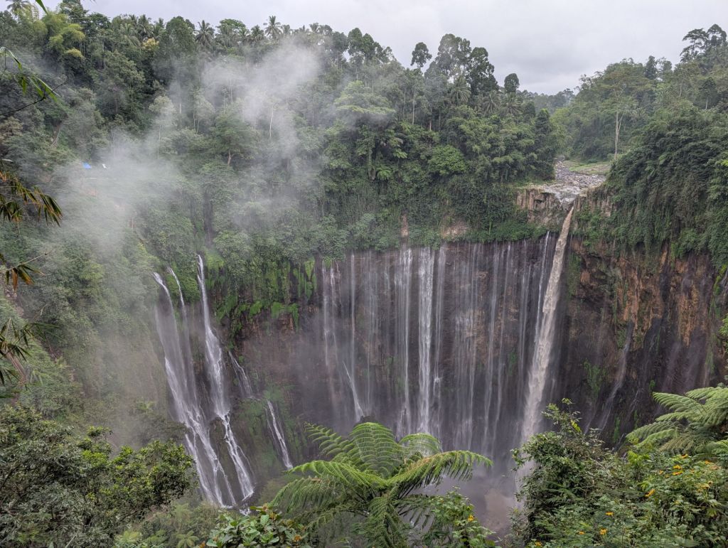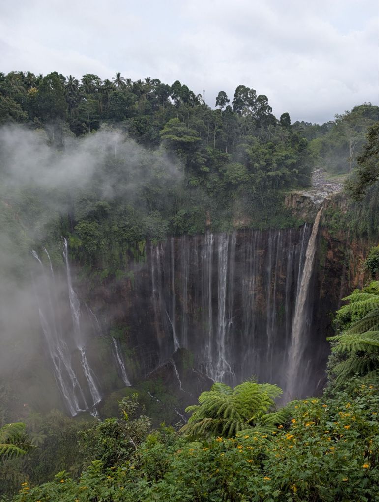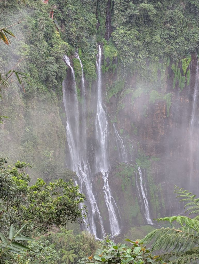 Der Tumpak Sewu ist sehr schön. Das Wasser fällt aus 120m Höhe in die Schlucht. Alles ist feucht und neblig.