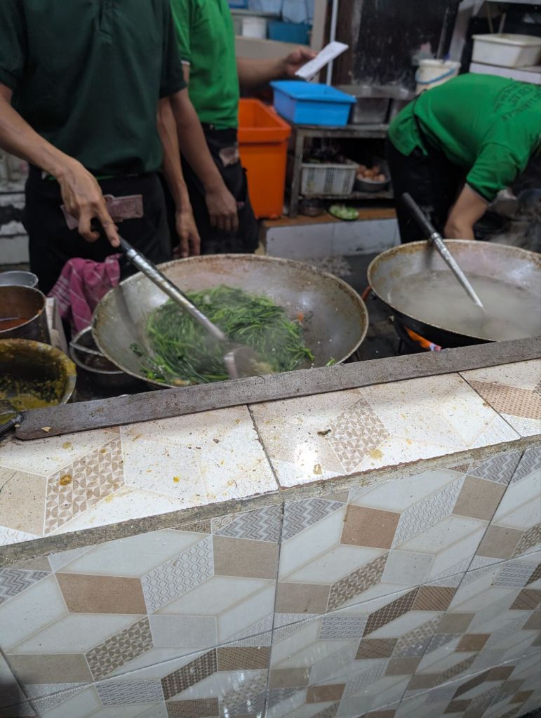 Dazu gab es Reis und gekochter Wasserspinat. War sehr lecker.