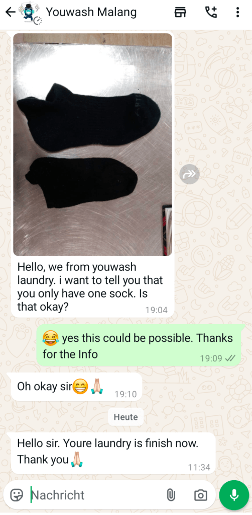 Gestern haben wir unsere Wäsche im Waschsalon abgegeben. Wir haben dann folgende Info vom Waschsalon per WhatsApp bekommen: