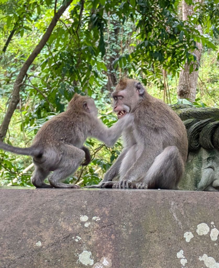 Der Monkey Forest war zwar total touristisch aufgemacht, aber total schön. Das ist auf jeden Fall ne Empfehlung. Wir haben da soviele coole Szenen mit den Affen gesehen. Hat voll viel Spaß gemacht. Und der Park ist super gepflegt bzw. verwildert.