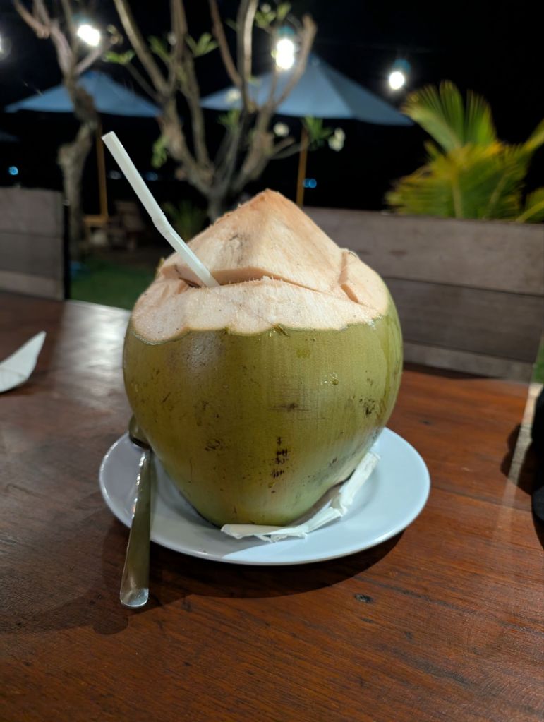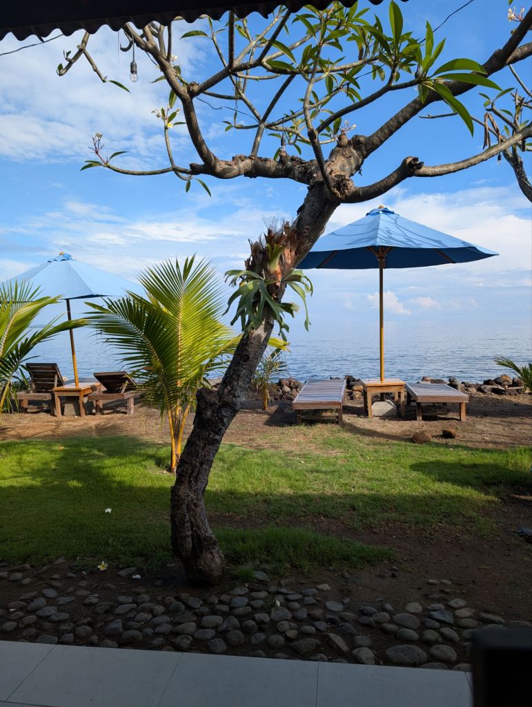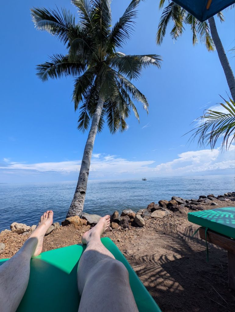 Guten Morgen aus Tanjung auf Lombok. Wir haben nicht so gut geschlafen. Mehrfach aufgewacht. Es war relativ laut gewesen. Nach einem leckeren Frühstück haben wir 2 Liegen beschlagnahmt und bis Abends nicht mehr hergegeben.